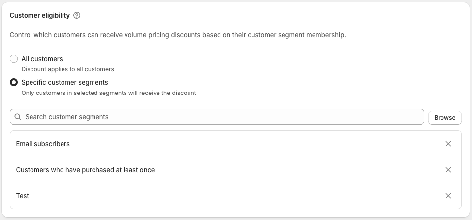 Only customers in the selected Shopify customer segments will receive volume pricing.