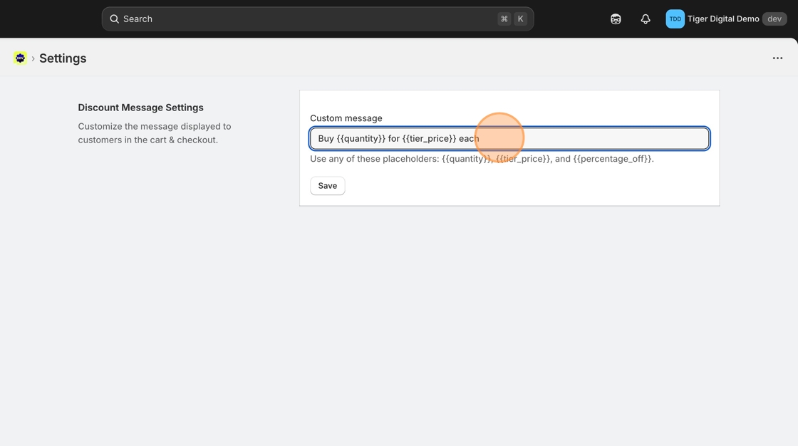 These placeholders can be placed anywhere in your message - the app will replace them with live values when the discount is applied.