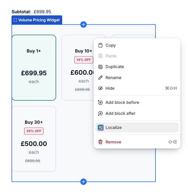 (If it’s not, click Add Block → Apps → Volume Pricing Widget and save.)